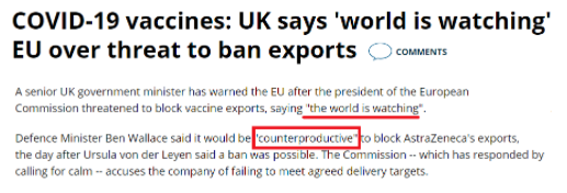 而英国官员此前曾回应称,阻止英国阿斯利康公司在欧盟境内生产的新冠疫苗出口至其他国家和地区,可能让欧盟的声誉受损,因为“全世界都在看着”。