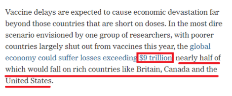 文章进一步指出,西方国家通过和制药公司联手等方式大幅增加疫苗供给,却不顾世卫组织有关分享疫苗的呼吁。但这些富裕国家却忘了,疫情时代没有人能独善其身。“最可怕的情况是,由于贫穷国家今年基本上无缘接种疫苗,全球经济可能会遭受超过9万亿美元的损失,而其中近一半将由美英等富裕国家承担。”
