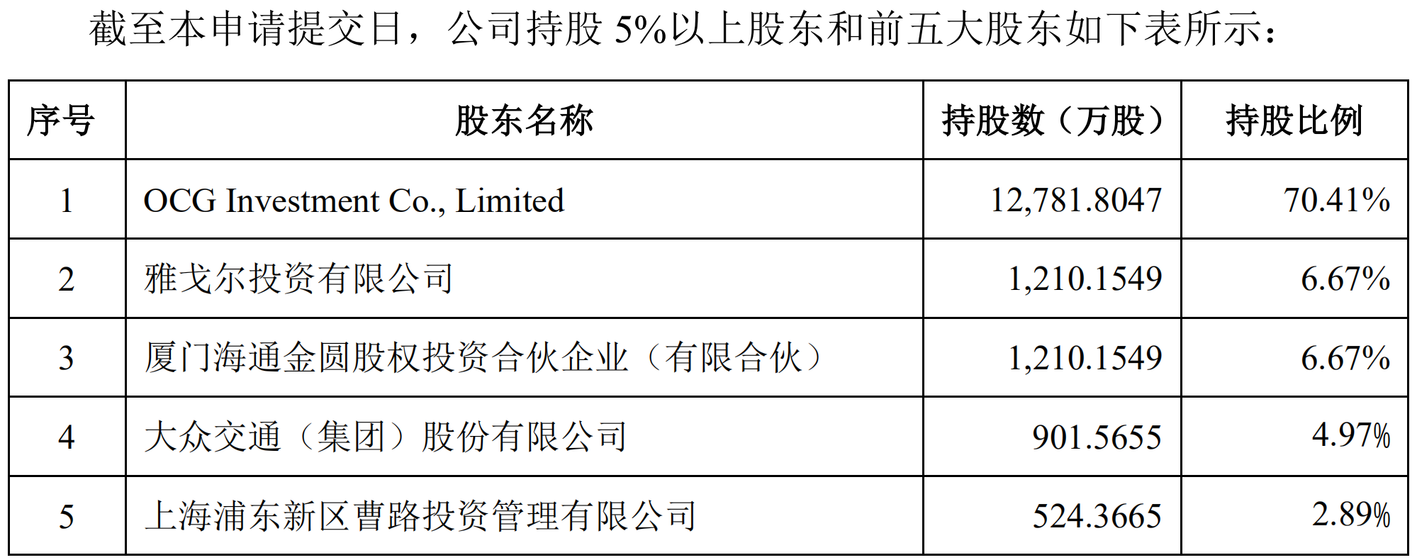 除OCG Investment Co.,Limited外,截至目前,东冠健康的前五大股东还包括雅戈尔投资有限公司(雅戈尔(600177,SH)全资子公司)、厦门海通金圆股权投资合伙企业(有限合伙)、大众交通(600611,SH)、上海浦东新区曹路投资管理有限公司,持股比例如下: