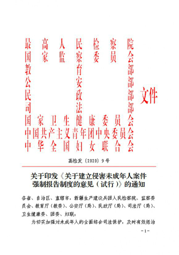 2020年5月,最高检等九部门联合下发《关于建立侵害未成年人案件强制报告制度的意见(试行)》,共同建立侵害未成年人案件强制报告制度,规定9类未成年人遭受或疑似遭受不法侵害情形,有关单位和个人须立即报案。