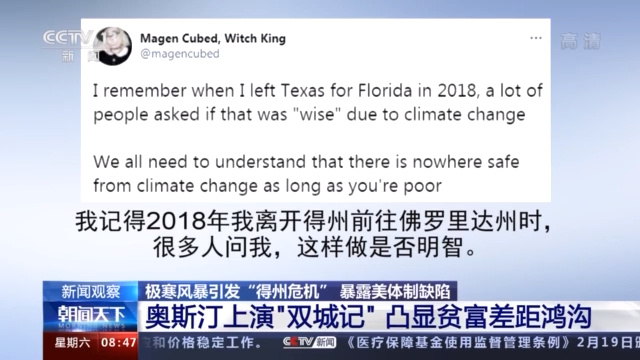 “我们现在在得州断电问题上看到了贫富差距,之前是疫情、股市和监狱体系。”