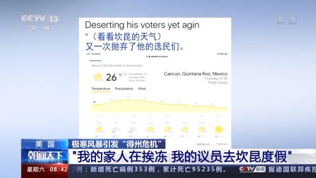 来自社交媒体的照片显示,克鲁兹和家人17日搭乘飞机前往墨西哥海滨城市坎昆度假。坎昆18日早上气温在26摄氏度左右,而连日来得克萨斯州多地的气温降至零下。