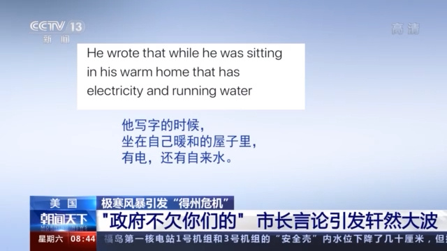 有网友斥责得州政府不作为。“结果就是,不论谁最后从得州的天寒地冻中活过来都会破产。得州政府似乎没做什么来帮助居民度过这次可怕的危机。用电、食物、酒店等价格飙升完全不合理。