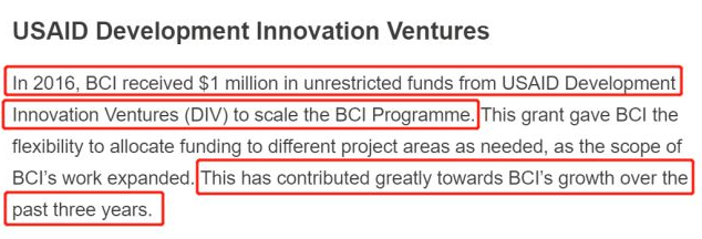 很重要的一个原因就是,BCI已经从原本的非盈利组织,变成了谋求盈利的组织,而BCI背后的“金主”之一正是美国国际开发署(USAID)。