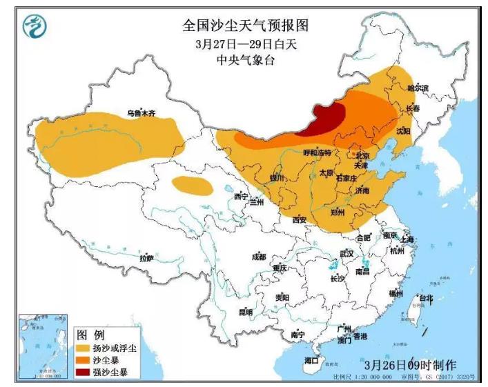 根据中央气象台最新预报结果,预计27日至29日白天,受蒙古气旋影响,北方地区将出现大范围沙尘天气,新疆东部和南疆盆地、青海西北部、内蒙古、宁夏、甘肃中东部、陕西中北部、山西、河北、北京、天津、山东、河南、安徽北部、江苏北部及辽宁西部、吉林西部、黑龙江西南部等地有扬沙或浮尘天气,其中,内蒙古中西部和东南部、河北北部、北京北部、辽宁西部等地的部分地区有沙尘暴,内蒙古中部偏北地区有强沙尘暴。受此影响,我国北方地区将出现大范围的空气质量恶化,总体转差3-4个等级,出现大范围的重度及以上污染,具体情况为: