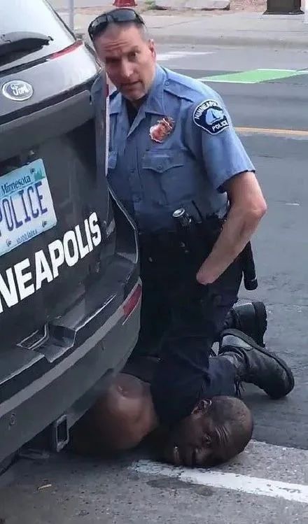 画面右下角半跪的警察,姿势神似跪压锁喉黑人弗洛伊德致死的美国警察。