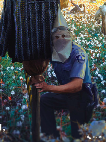 这幅题为——Blood Cotton Initiative (血腥棉花发展计划)的画里,描绘的了一群用白色尖帽蒙脸的记者和警察,在棉花地围着一个稻草人进行采访,而他们身后是正在辛苦采棉的黑奴们。