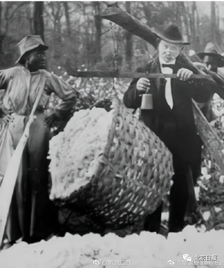 还有网友注意到,画中有戴着白色尖帽的人,用鞭子抽打黑奴的情景。这是当年黑奴们真实的血泪遭遇。