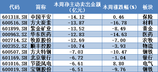 本周两市超大单主力资金净主动卖出前10只个股
