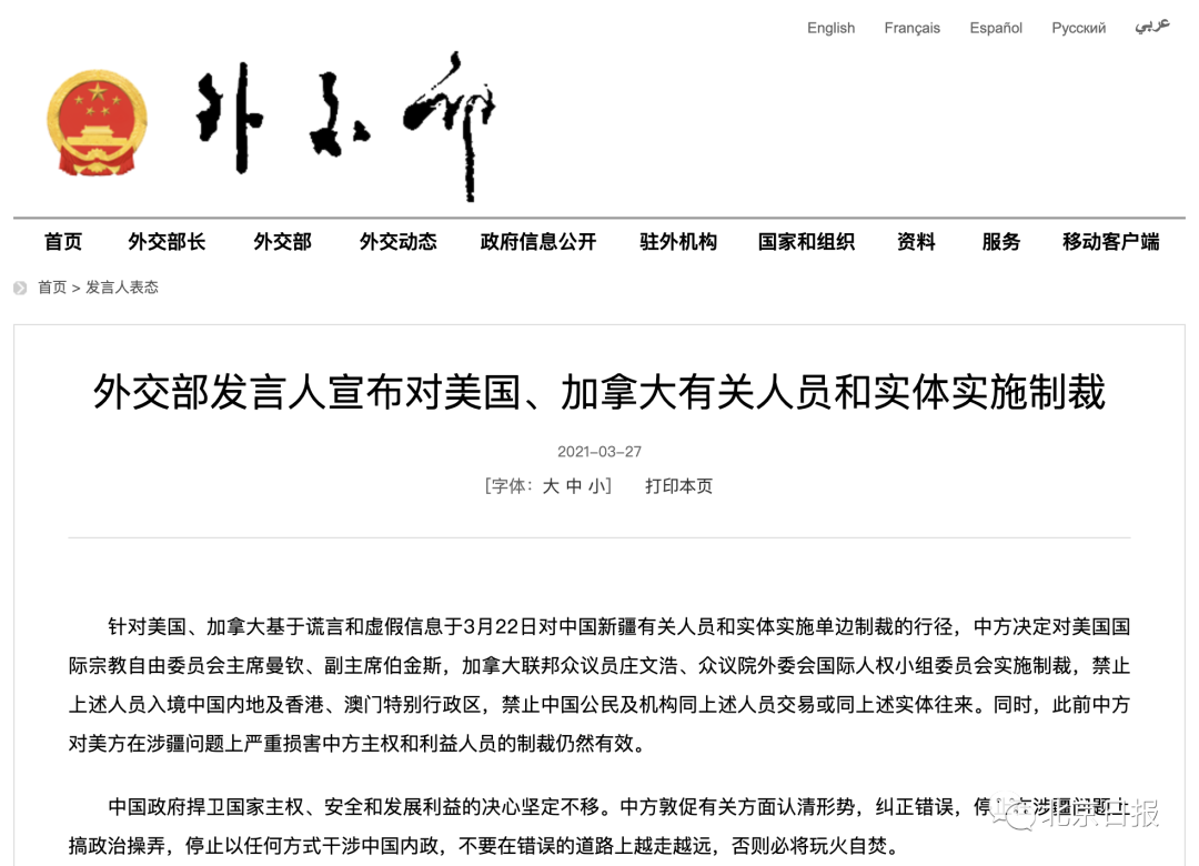 针对美国、加拿大基于谎言和虚假信息于3月22日对中国新疆有关人员和实体实施单边制裁的行径,中方决定对美国国际宗教自由委员会主席曼钦、副主席伯金斯,加拿大联邦众议员庄文浩、众议院外委会国际人权小组委员会实施制裁,禁止上述人员入境中国内地及香港、澳门特别行政区,禁止中国公民及机构同上述人员交易或同上述实体往来。同时,此前中方对美方在涉疆问题上严重损害中方主权和利益人员的制裁仍然有效。