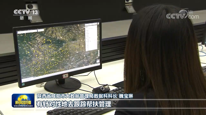 在陕西咸阳精准扶贫大数据平台,正在进行的是防止返贫动态预警监测,脱贫户的产业发展、收入构成等数据在平台上一目了然。