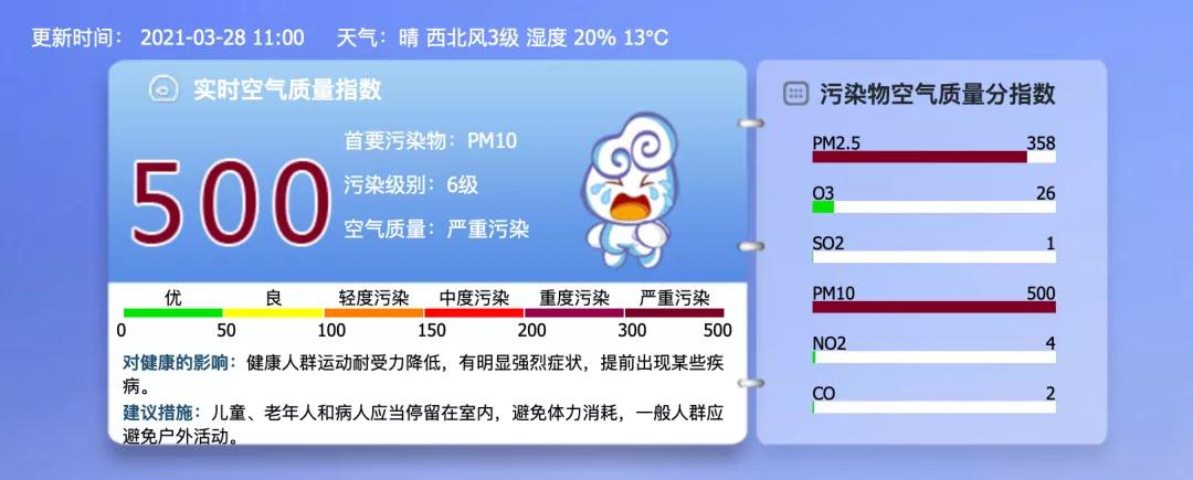 编辑再通俗地给大家解释下:本次沙尘天气上午最严重,下午会逐渐好转,晚上空气质量更好些,但是明天(3月29日)风向转移,沙尘还会杀一个回马枪,所以也不能放松警惕。