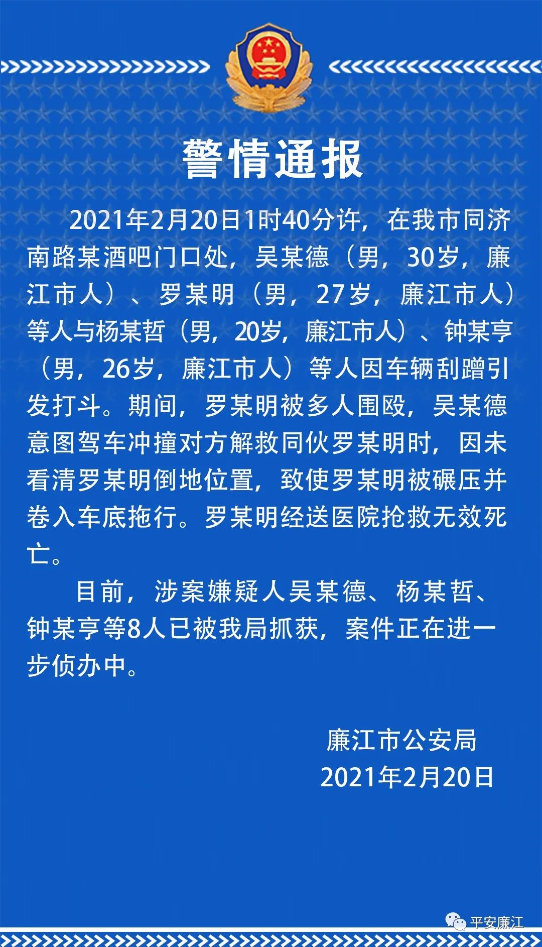 2021年2月20日1时40分许,在廉江市同济南路某酒吧门口处,吴某德(男,30岁,廉江市人)、罗某明(男,27岁,廉江市人)等人与杨某哲(男,20岁,廉江市人)、钟某亨(男,26岁,廉江市人)等人因车辆刮蹭引发打斗。期间,罗某明被多人围殴,吴某德意图驾车冲撞对方解救同伙罗某明时,因未看清罗某明倒地位置,致使罗某明被碾压并卷入车底拖行。罗某明经送医院抢救无效死亡。目前,涉案嫌疑人吴某德、杨某哲、钟某亨等8人已被抓获,案件正在进一步侦办中。