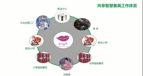该作品提出了共享餐具的概念:植入了芯片的餐盒从中央消毒工厂消毒、性能检测后配送至配送中心,由配送中心发往各个商家,商家装好食物后由外卖小哥放入共享智能餐柜,用户食用完毕后送回共享智能餐柜,外卖小哥取出送回中央消毒工厂,工厂进行厨余垃圾的回收以及餐具消毒检测程序。目前,作品的指导老师团队也在商谈快递餐盒的芯片植入和整个产业链的建设问题。
