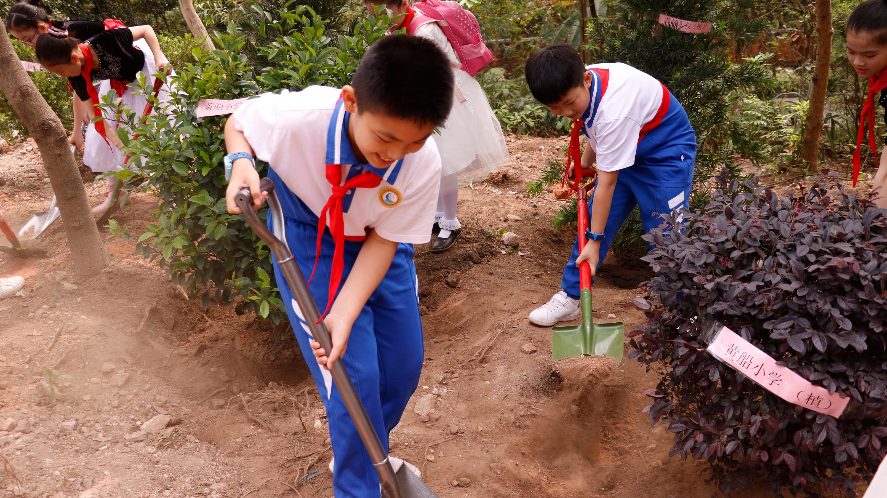 只见黄船小学的少先队员们拿着铲子,干得不亦乐乎。在短短半个小时的劳动中,这群小朋友脸上洋溢着灿烂的笑容,似乎都感受到了植树的快乐。