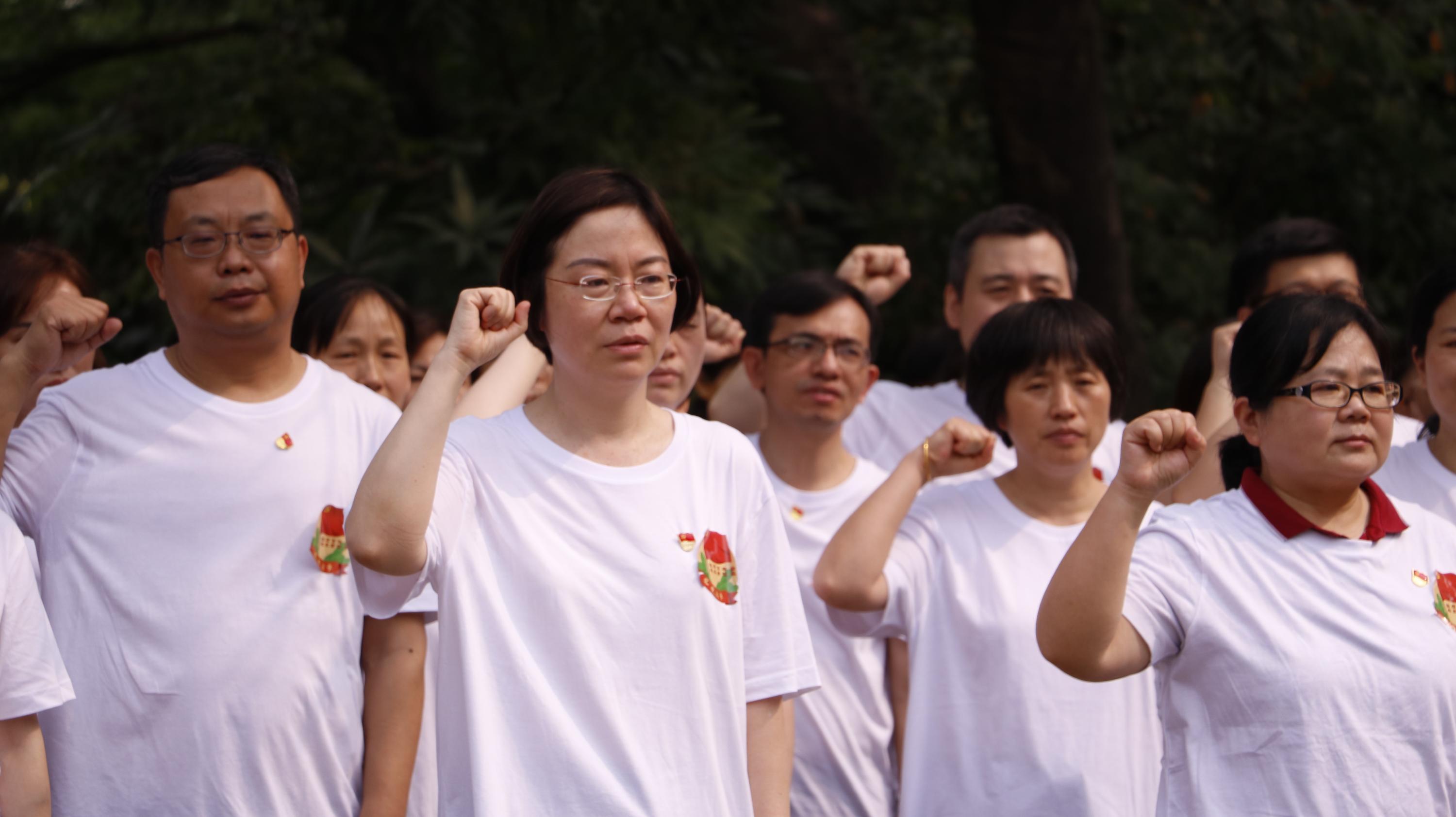 在全国卫生健康系统新冠肺炎疫情防控工作先进个人、广东省中医院副院长张忠德的领誓下,在场的党员同志都高举右拳,庄严地宣读入党誓词,满怀激情的宣誓声让现场所有人都深受感染。