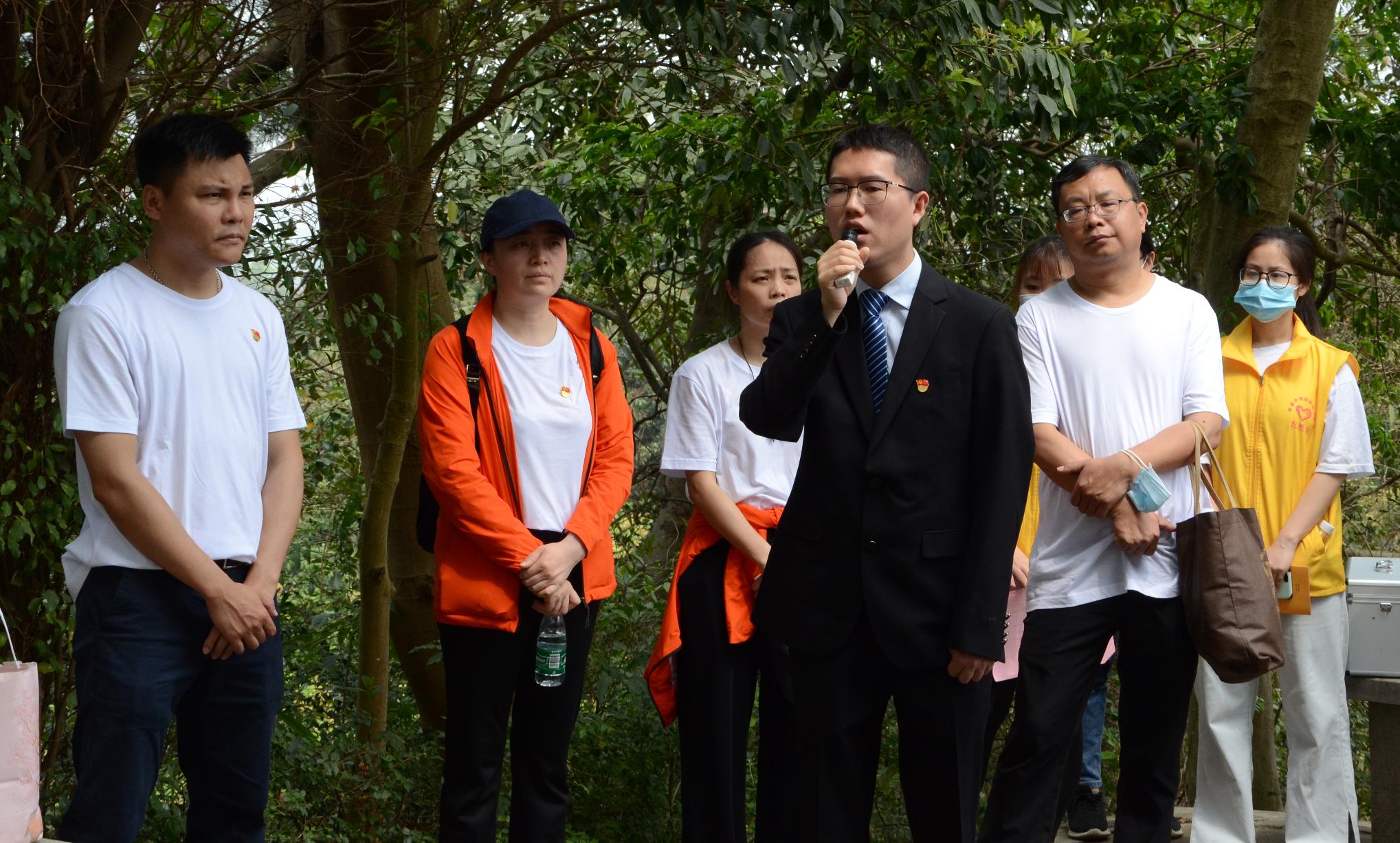 徒步队伍从东征阵亡烈士墓园出发,第一站抵达北伐纪念碑。通过敬献花篮和现场微党课让全体成员了解叶挺独立团党员先锋的革命精神。