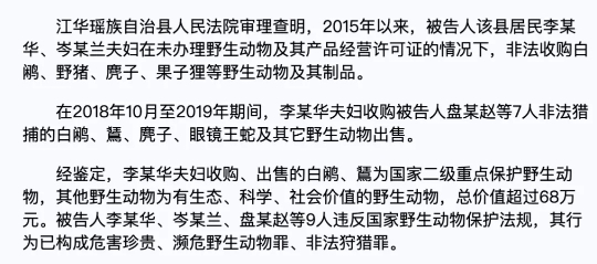 据法制周报报道,3月18日,湖南江华瑶族自治县人民法院依法公开宣判一起危害珍贵、濒危野生动物案件,9名被告被判刑,并处罚金和赔偿相应的生态修复费47万余元。