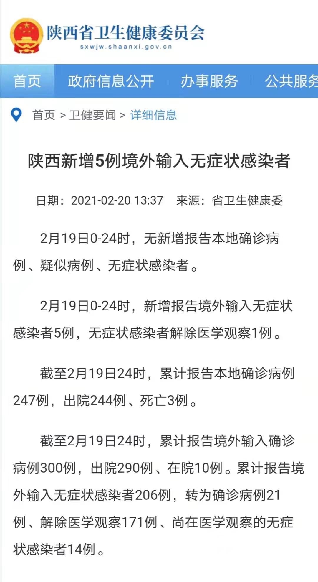 2月19日0—24时,陕西新增报告境外输入无症状感染者5例,无症状感染者解除医学观察1例。