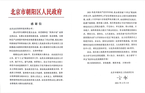 牛年新春,国内领先的保险科技服务商豆包网收到来自北京市朝阳区人民政府的特快专递,对豆包网全体员工及家属在过去一年的不懈努力表达衷心感谢,并致以新春祝福。