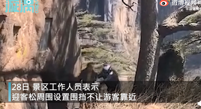 3月26日,安徽黄山,一名男子私自翻栏杆,跑到迎客松下边被保安一把拽回。28日,景区工作人员表示,迎客松周围设置围挡不让游客靠近,有的人会对树撕扯,这样的行为对树也危险,对人也危险。提醒:请文明游园!