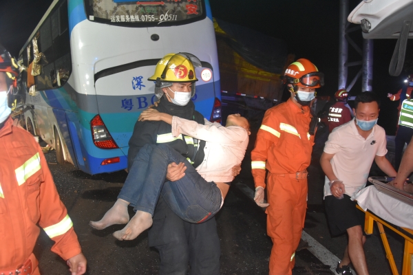 遂溪消防到达现场后,发现两辆大货车与一辆大客车连环相撞,被困群众人数较多,现场情况十分危急。指挥员立即安排人员警戒,并组织人员开展救援行动。指战员进入事故车辆内部,一边对变形车辆进行破拆救援,一边安抚被困群众,先后搜救出10名被困人员,疏散30余人。