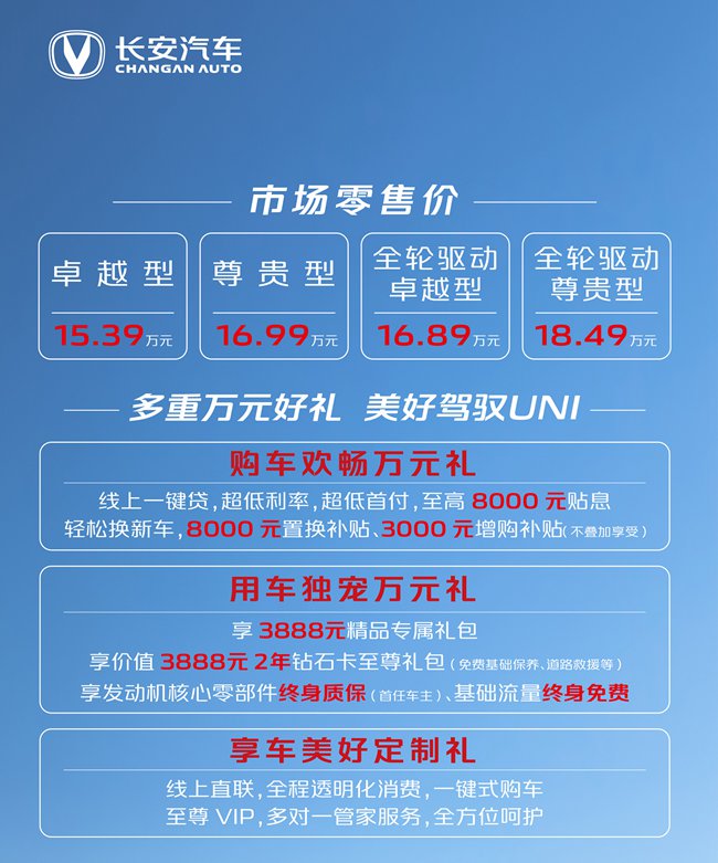2021年3月28日,长安汽车在UNI星球体验空间举行了UNI用户庆典活动,并在全国UNI用户的见证下,正式宣布长安乘用车高端产品序列旗舰车型UNI-K正式上市。新车搭载2.0T+8AT动力组合,提供两驱和四驱版本,此次上市共推出了四款车型,售价区间为15.39-18.49万元。