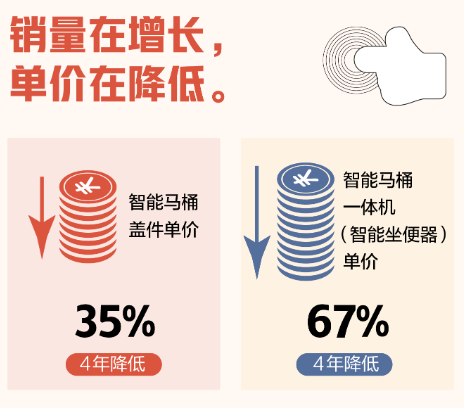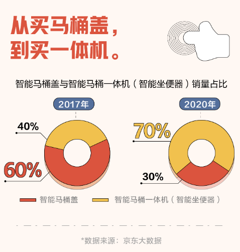 销量方面,据京东大数据研究院联合京东居家发布的《2021智能马桶线上消费趋势报告》显示,2017-2020年4年间,智能马桶盖销量翻番,智能马桶一体机销量更是翻了10倍。2020年疫情发生之后,具有家庭健康护理属性的智能马桶,被更多人视为居家生活标配。