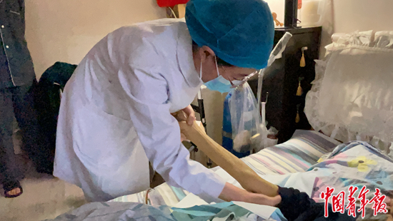 description="北京佑安医院的老年专科护士孙晓玲为患者提供上门服务,她正在给患者进行静脉采血前的准备。中青报·中青网记者 刘昶荣/摄"