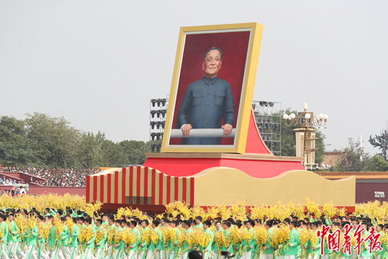 2019年10月1日,北京天安门广场,庆祝中华人民共和国成立70周年大会,邓小平同志的巨幅画像,在群众簇拥下出现在游行队伍中。中青报·中青网记者