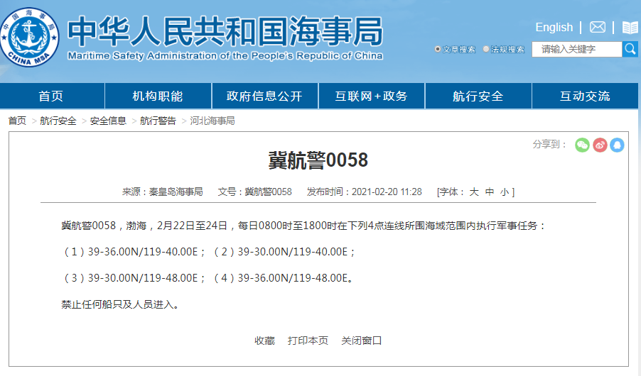 冀航警0058,渤海,2月22日至24日,每日0800时至1800时在下列4点连线所围海域范围内执行军事任务: