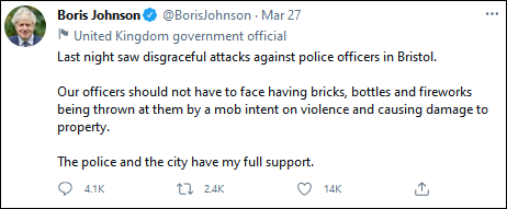 “昨晚在布里斯托尔发生了针对警察的可耻袭击。”约翰逊在社交媒体推特上写道,“我们的警官不应当面对那些意图制造暴力并损坏他人财物的暴徒所扔掷的砖块、瓶子和爆竹。”