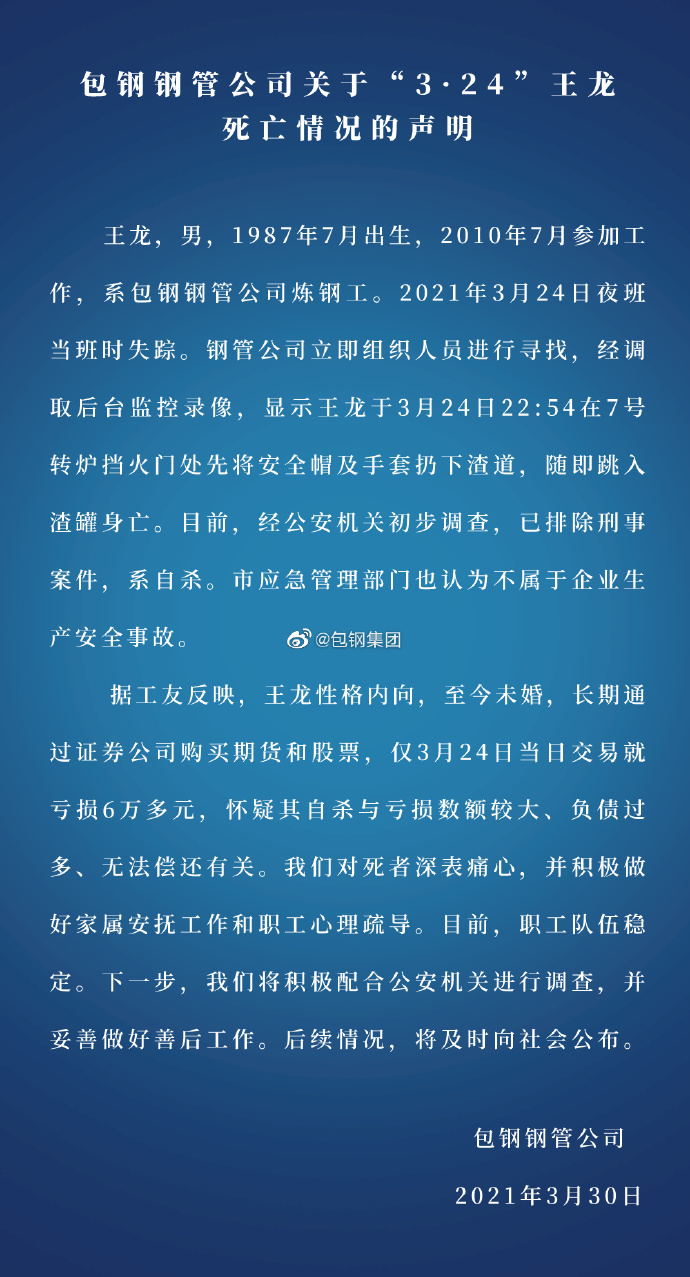 3月29日,一条有关“包钢集团男职工疑因压力大跳入高炉钢水中自杀”的视频在网上传播。3月30日,包钢集团微信公众号发布通报称,已排除刑事案件,系自杀。(包钢集团微博)