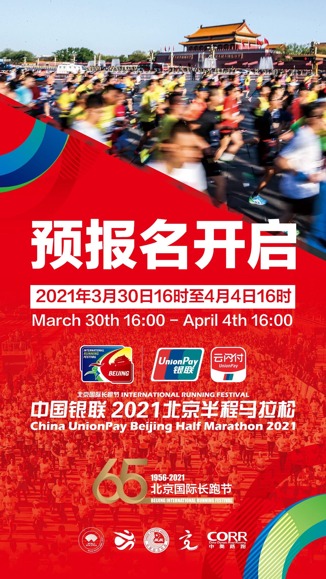 北京国际长跑节——北京半程马拉松起源于1956年举办的“北京市胜利杯环城赛跑”,后更名为“北京春节环城赛跑”。2007年赛事正式更名为“北京国际长跑节”,2016年升级为半程马拉松,截至今年,已经走过了整整65年历程。