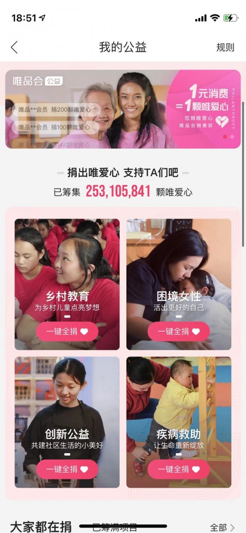 “唯爱心公益计划”持续通过“我的公益”平台,联合社会各界上线优质公益项目,搭建多元力量创新协作的端口,为用户提供更便捷的公益参与方式,实践“行小善,成大爱”,打造一个共融和谐的社会。