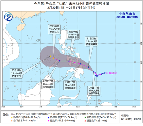 今年第1号台风“杜鹃”(热带风暴级)的中心今天(20日)下午5时位于菲律宾马尼拉东南方约1190公里的西北太平洋洋面上,就是北纬7.6度、东经129.2度, 中心附近最大风力有9级(23米/秒),中心最低气压990百帕,七级风圈半径120~200公里。
