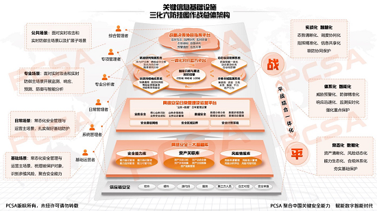 PCSA和安全联盟成员实践过程中,形成“挂图作战”共生系列解决方案三库三平台建设,确保“资产清晰化、风险动态化、能力生态化”,满足“动态防御,主动防御,纵深防御,精准防护,整体防护,联防联控”的安全保障需求,实现一体化安全管理运营与指挥协同挂图作战。