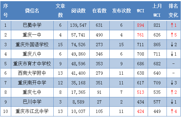 2月中学公号WCI TOP10。重庆市教委 供图 华龙网-新重庆客户端 发