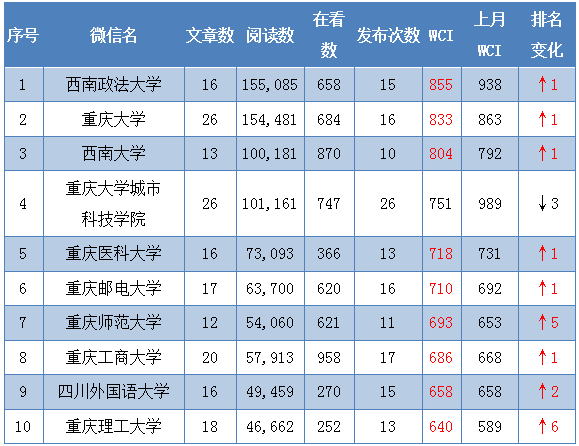 2月本科院校公号WCI TOP10。重庆市教委 供图 华龙网-新重庆客户端 发