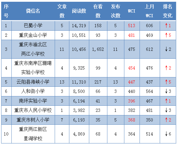 2月小学公号WCI TOP10。重庆市教委 供图 华龙网-新重庆客户端 发