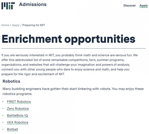 麻省理工招生官网将Botball列为推荐项目