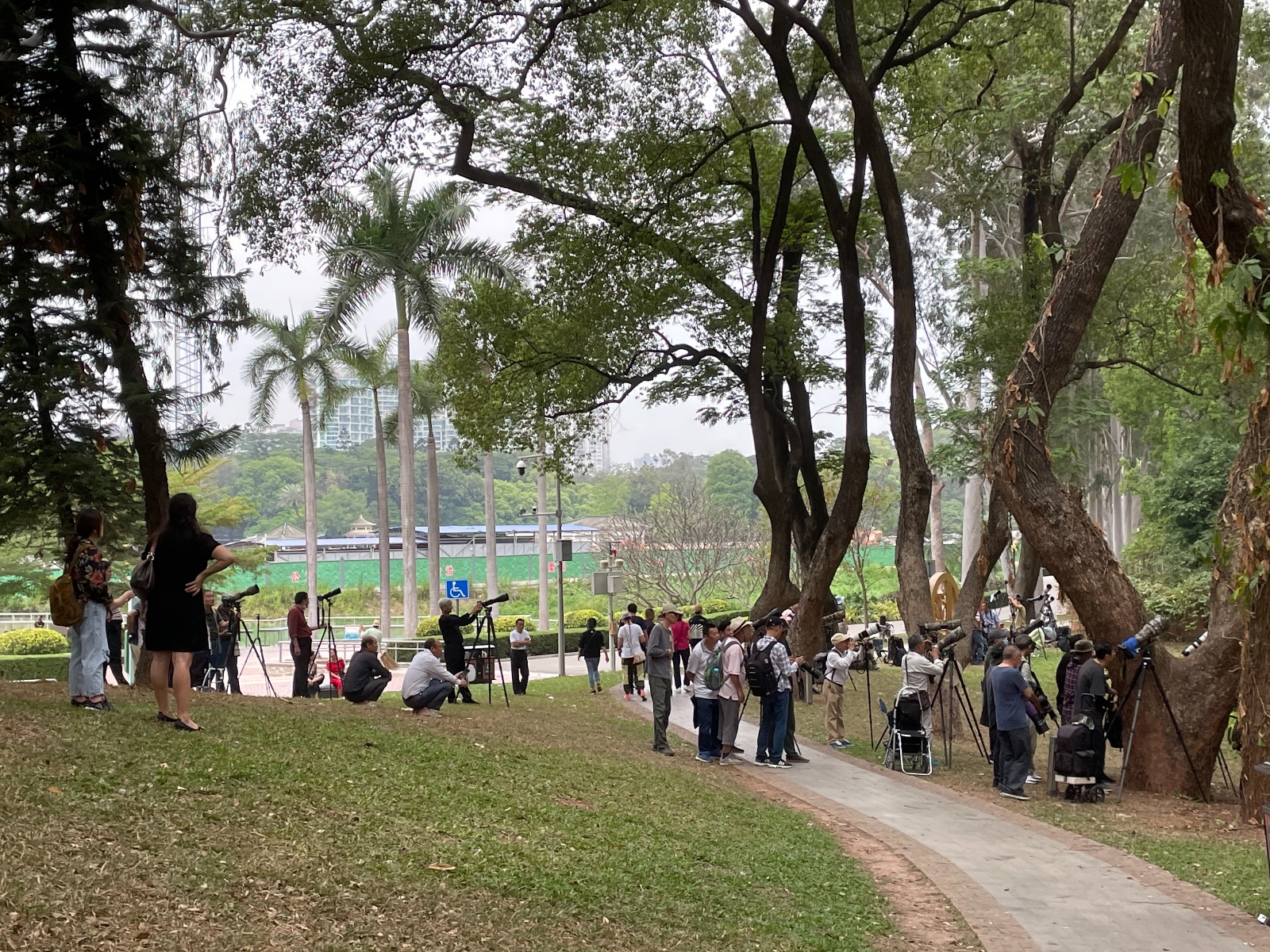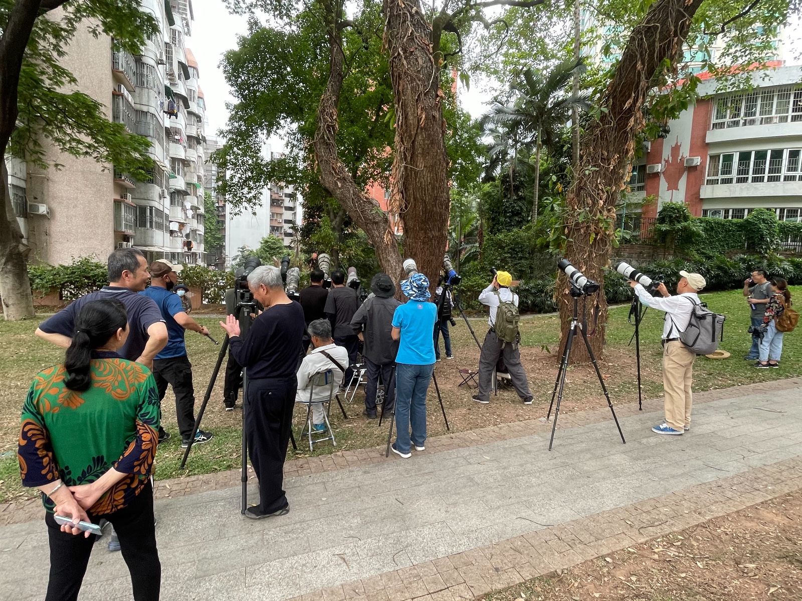 小e近日从天河公园南门进入,远远就看到前方斜坡下聚集着一大批摄影爱好者,个个拿着“长枪短炮”, 镜头齐刷刷朝着一棵树其中一段分枝,有些甚至带来便携式小椅子,坐在椅子目不转睛看着取景器,生怕错过任何精彩瞬间。