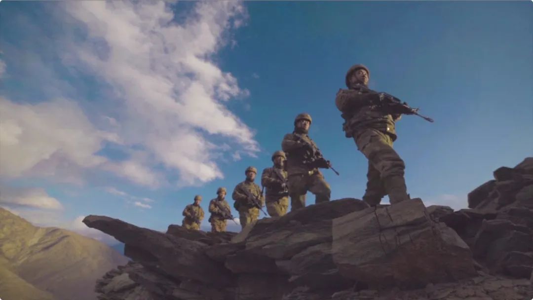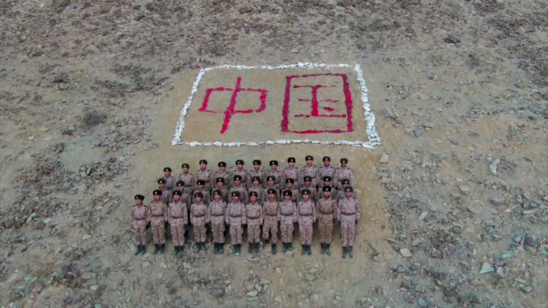 视频中有一个画面格外显眼:在边防官兵们列队准备迎敌反击、准备用生命扞卫祖国领土时,在他们前方的石头上赫然写着两个大字——中国。