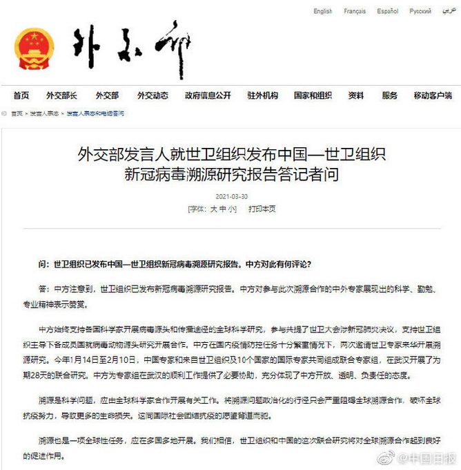 3月30日,问:世卫组织已发布中国—世卫组织新冠病毒溯源研究报告。中方对此有何评论?