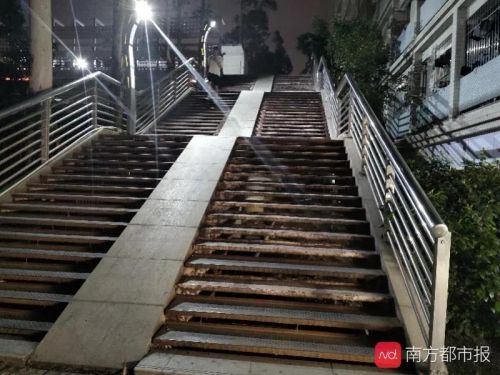 记者走访观察到,一号天桥主体设有棚顶,上下阶梯是露天的,扶手两侧为斜坡,中间为阶梯,均铺设石板;二号天桥完全露天,斜坡在阶梯中间,阶梯为铁板材质,长期的风吹日晒,表层有锈迹,两座天桥阶梯均未见明显防滑措施。李同学称在下雨天,曾在天桥阶梯差点滑倒。