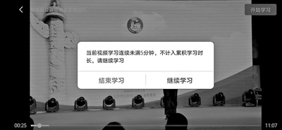 但需要注意的是,如果用户将APP放入后台,并在途中清空后台缓存,学习视频已读进度将消失,用户需重新进入此前记录的时长,继续学习。如果长时间无反应,系统将提示观看异常,并提示“继续学习”或“退出观看”。