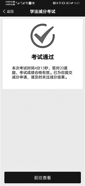 记者答题过程耗时4分13秒,首次考试通过后,需重新进入学习,可再次参加考试。APP直接从系统中完成“减分”。从注册到完成“减分”,记者减1分耗时35分钟左右。
