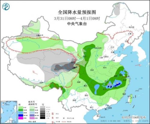 3月31日08时至4月1日08时,新疆北疆西部和南疆南部、西藏北部、西北地区中部、甘肃南部等地部分地区有小到中雪或雨夹雪,局地有大到暴雪(10~11毫米)。内蒙古中西部、西藏东南部、西北地区东南部、江淮大部、江汉东部、江南北部和西部、西南地区东北部等地部分地区有中到大雨,其中,江西北部、浙江西南部等地部分地区局地有暴雨(50~65毫米)。内蒙古西北部、西藏中部、浙江北部等地部分地区有4~6级风。