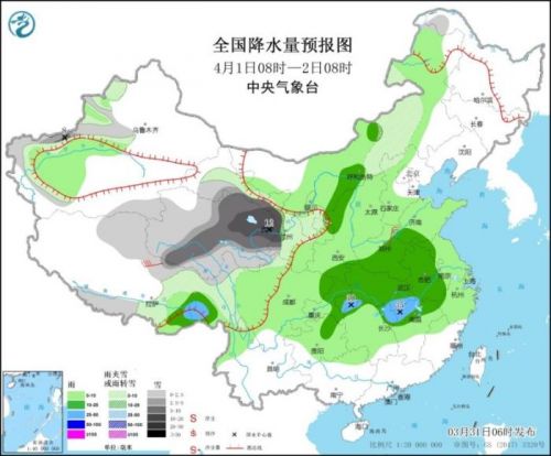31日至4月2日,我国北方地区自西向东有大范围雨雪天气,新疆北疆西部、青海、甘肃中南部等地有中到大雪或雨夹雪,局地暴雪,华北、东北、黄淮及陕西等地有小雨。