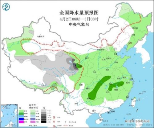 4月2日08时至3日08时,新疆伊犁河谷和南疆南部、西藏东部、西北地区中部、内蒙古东北部等地部分地区有小到中雪或雨夹雪,局地有大到暴雪(10~11毫米)。新疆南疆盆地、内蒙古河套地区、东北地区大部、甘肃河西、西北地区东部、华北大部、黄淮、江淮、江汉、江南、川西高原北部、西南地区东部、华南西北部等地部分地区有小到中雨。内蒙古东北部、辽宁中部、甘肃河西等地部分地区有4~6级风。